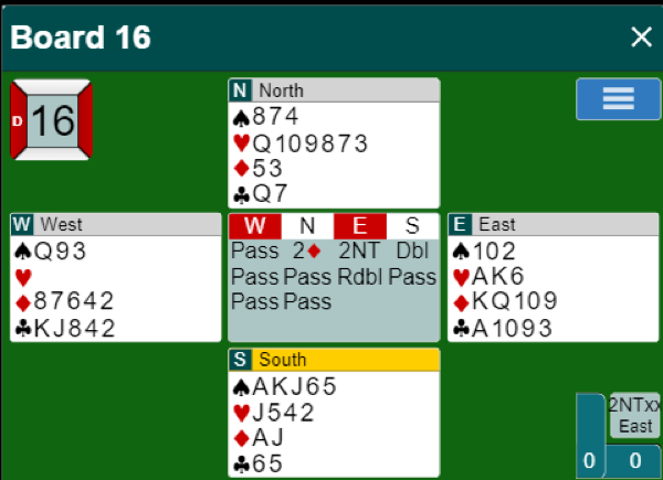 Etter multi-2D (svake 2 i en majorfarge) fra nord ville vel de fleste på syds plass sørget for å komme seg i 4 i majorfarge hvor hun vet de har 10 eller 11 korts trumftilpasning. Bertheu sin makker Baroni mente imidlertid det var greit å doble først. Øst mente neppe redoblingen for spill, men vest trodde dette kunne stå og passet. Og 2NT står om spillefører gjetter kløveren. Spar ess kom i utspill fulgt av hjerterskift til østs ess. Tipper hun kløveren nå kan hun sette opp ruteren også. Da kan det bli det minst to redoblede overstikk, "kun" ti stikk om syd tar for den andre sparhonnøren. To redoblede overstikk i 2NT ville gitt den uvanlige scoren +1680!