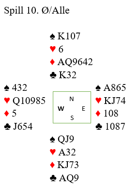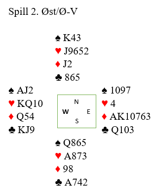 Her hadde vest en enkel melding (3NT) med KQ10 i hjerter, og de finner den eneste utgangen som står. Hvis vest hadde hatt dårlig hjerter kunne de funnet 5 ruter som i så fall normalt ville hatt en god sjanse (vest har i så fall lite i hjerter og flere poeng i den andre fargene).