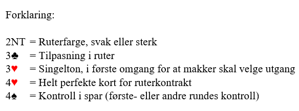 Full uttelling for dette opplegget får du om en så ypperlig slem som dette finnes, men også om 3NT unngås i de tilfellene hvor det kanskje ikke er en eneste stopper i svarhåndens kortfarge.