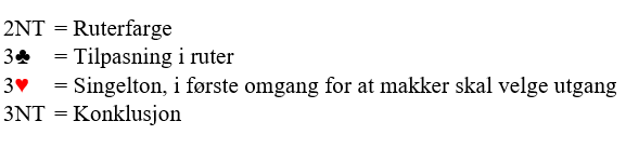 Hvis ikke Ø/V har et opplegg for å finne ut slikt må øst gjette hva som er riktig utgang. Hvis han bare går for 3NT uten å vite hva som er riktig kan det hende det blir en nitrist utgang, av og til helt uten hjerterstopper. Det er glimrende for svahånden å fortelle hva han har og la grandåpneren få bestemme!