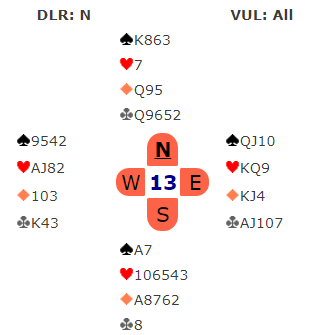 Ps. I teorien kan 7 ruter vinnes. Det forutsetter imidlertid en spilleplan som ikke er riktig å satse på. Det blir å spille med åpne kort og velge en marginal plan som fungerer kun med en spesifikk sits. Så dette blir for de spesielt interesserte. Men på resultatsiden står det under spillene en computeranalyse som forteller hvor mange stikk som kan vinnes, og der står det at det KAN vinnes tretten stikk i ruterkontrakt her - i teorien. Hvordan?