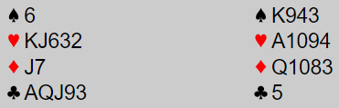 Ø/V meldte ved det bordet 4 hjerter uten noen meldinger fra N/S. Da valgte nord å spille ut kløver til kongen og esset. En spar ble spilt mot kongen, og nord tok for esset. Nå burde nok nord ha skiftet til ruter, men da han ikke gjorde det ble spillefører kvitt en ruter på spar konge og fikk til slutt hele elleve stikk. Og det bli like mange IMP (11) til Heimdal på spillet i kampen som de vant med 10 IMP.