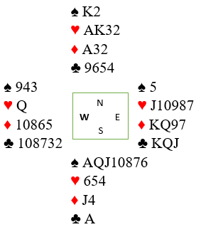 Her er det ingen muligheter for å etablere noe ekstra stikk i noen sidefarge. Det kunne det vært i hjerter om en ser kun på N/S sine kort og ikke vet at hjerteren sitter skjevt pga. østs åpning 1 hjerter. Uten meldinger fra motparten kunne hjerterfargen ha vært fordelt 3-3 og gitt ett ekstra stikk.