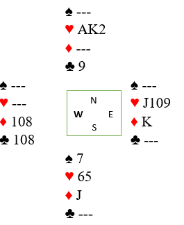 Men så er det det med å gi bort ett stikk. Hvis du vinner utspillet og tar ut trumfen må du altså få gitt vekk ett stikk (rectify the count) før det skal skvises. Det kan skje ved at du dukker en hjerter, men da blir det trøbbel med overgangene hvis øst spiller en tredje runde hjerter.