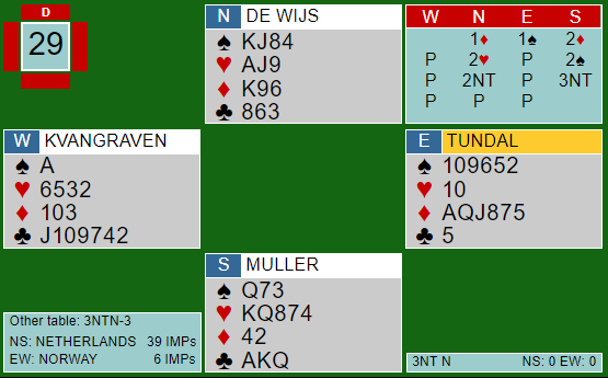 Ved det andre bordet meldte øst inn 3 ruter som viste ruter og spar, og da motparten kom i 3 grand spilte øst ut spar 10. Vest vant med esset og spilte ruter 10 tilbake. Det var drepende motspill, Ø/V fikk seks ruterstikk i tillegg til spar ess, +300 til Nederland. Spillet ga hele 14 IMP til grunnspillets vinnerlag.