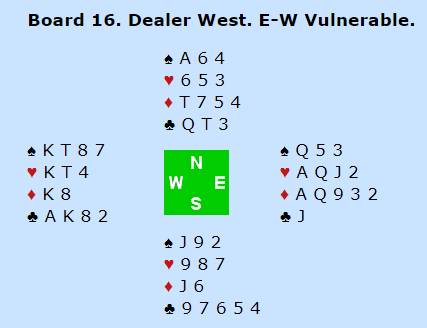 Ruteren satt ikke 3-3, og N/S fant ikke på å spille ut ruter som er fatalt. Det skjedde ved noen få bord. Med ruter ut fra enten syd eller nord rulles ruterstopperen opp for N/S og 6 NT vinnes. Men det norske paret fikk tak i beten etter hjerterutspill, 12 IMP inn.