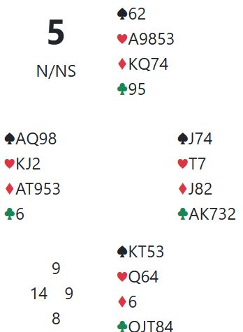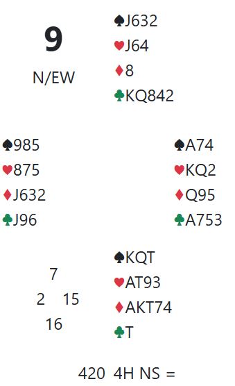 N/S har utgang i kortene, både 3NT og 4 hjerter står. Men 1NT doblet ble på ingen måte noen fest for Ø/V. Bakke-Brogaland fikk tak i tre doblede sonebeter, Europa +800.