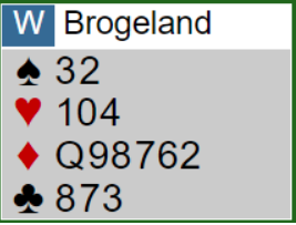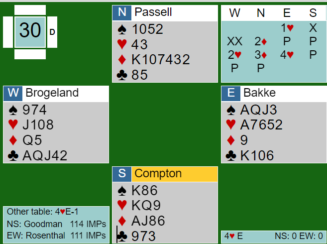 Mot østs 4 hjerter spilte Compton ut ruter ess og fortsatte fargen til damen, kongen og stjeling hos spillefører.