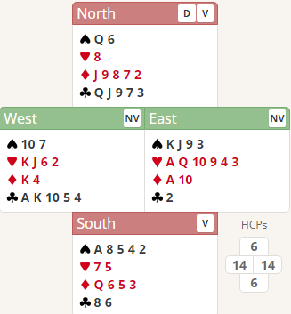Ved noen få bord meldte syd inn 1 spar over østs åpning 1 hjerter. Da er slem ikke så bra, større sjanse for at både esset og damen i spar er bak østs K-J. Men N/S er i ugunstig sone så de fleste sa pass med syds kort.