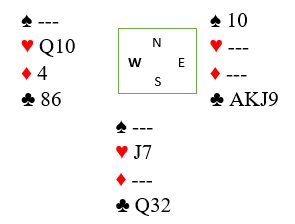 Vi tenker oss altså at i dette scenariet har vest fått for de to sparstikkene. Spillefører har fortsatt tre hjertere som et problem. Men nå kan han trumfe en hjerter, så ta den siste trumfen fra øst og spille spar som har blitt en (trygg) måte å komme seg tilbake til vest. Han stjeler spar og kan ta ut trumfen før han fortsetter med resten av trumfene. Etter denne utviklingen ser det slik ut før den siste trumfen: