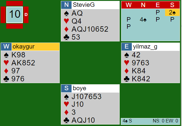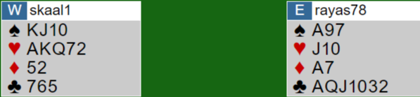 Brogeland (syd) var i 4 spar. Han fikk ikke noe skarpt motspill mot seg da vest tok to hjerterstikk før han skiftet til kløver 6, og øst satte i kongen. Da spilte nordmannen simpelthen spar til esset og spar dame, og forsvaret kunne ikke få for mer enn trumfkongen, N/S + 620.