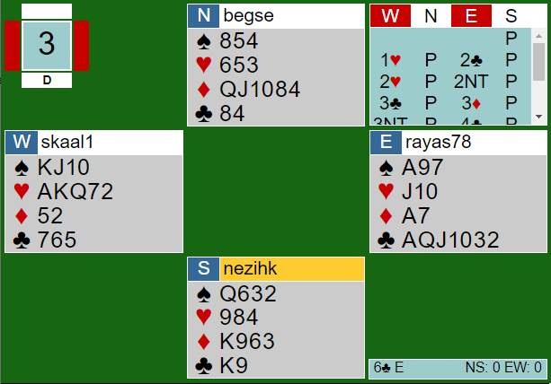 Her meldte Sælensminde-Gillis bra. Det startet med 1 hjerter-2 kløver, og i deres 2-over-1 GF baserte system kunne Gillis i andre melderunde si 2NT som krav. Vest fikk da vist trekorts kløverstøtte. Øst gikk på med en sleminvitt, og da vest var med på notene tok Gillis etterhert sjansen på 6 kløver.