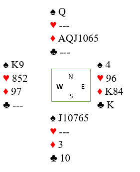 Idet syd spilte kløver 10 kastet vest ruter, og kløveren ble trumfet med nords spar dame. Spillefører måtte så komme seg hjem på hånden for å spille trumf, men da han spilte ruter ess og ruter fra nord får vest trumfhøyning siden han nå var blitt fri for ruter! Spillefører forsøkte å trumfe med syveren, men vest kunne trumfe over med spar 9. Med to trumfstikk til forsvaret ble det en bet.
