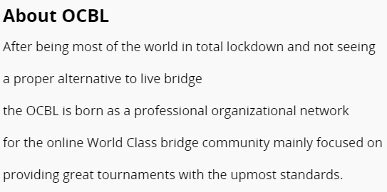 Den første OCBL for lag pågår akkurat nå. OCBL er altså en internasjonal online bridgeklubb som har til hensikt å arrangere lagturneringer med sterke, internasjonale lag på startlisten. I OCBL Cup 1 deltok 32 lag i kvalifiseringen, to av dem med norsk innslag. Ingen av de "norske" gikk videre til kvartfinale etter tolv kamper.