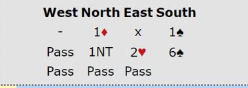 Erleta (øst) sin 4NT var kvantitativ (invitt). Merk at Mareni løftet til 6NT med 13 HP, egentlig ikke helt maks for de 12 (11) – 14 som hun har vist. Men dette (vests kort) er 13 gode med to bra farger.