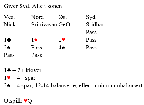 Litt merkelig, for det som tidlig så ut som to hjertertapere og en i hver minorfarge (fire tapere) endte med kun en hjertertaper, ingen rutetaper, men nord fikk TO kløverstikk(!) som totalt kun er tre stikk totalt til forsvaret.