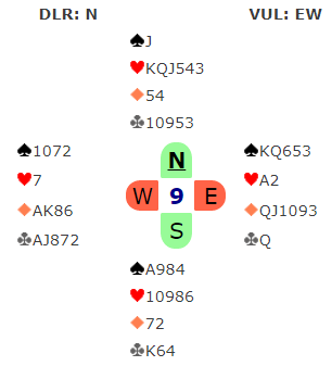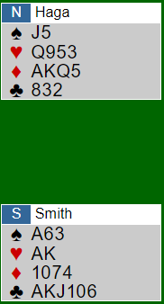 For sikkerhets skyld satt ruteren også og det ble tretten stikk, og ville blitt tolv stikk selv om kløverfinessen hadde sprukket for to av de tre slemmelderene da de fikk hjerter ut. Den tredje som meldte og vant 6 grand fikk press på seg med spar ut og ville gått minst tre bet hvis vest hadde hatt kløver dame.