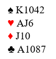 Det er 19 balanserte. Men det er klart at denne hånden er mer verd enn vanlige, balanserte 18-19 hender. Dette må nok oppvurderes, og det passer bra å vise disse kortene som 20-21 grand. Bridge handler tross alt om stikk, ikke antall honnørpoeng.