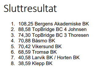 Topbridge-Johnsen hadde et best utgangspunkt før deres siste kamp mot Klepp. Med en fin seier der tok de en nokså klar andreplass, 20 VP bak vinnerlaget, og 14 VP foran nr. 3. På sølvlaget spilte Lasse, Aaseng, Tom Johansen, Jon-Egil Furunes, Jan Mikkelsen, Sverre Johnsen og Åsmund Stokkeland.