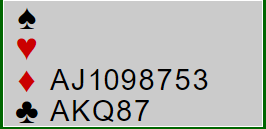 Jan Jansma meldte 4NT, begge minor. Nord hoppet til 6 kløver. Syd har en meget spesiell hånd, to renonser er ikke dagligdags. Og trumfen er helt i orden. Hva med ruteren? Det står fort i storeslem om makkeren har ruter konge, og det er vel bare håpløst i 7 kløver om nord har to små ruter. Er det sannsynlig at han hopper til 6 kløver uten topphonnør i trumf og ingenting i ruter?