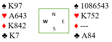 Det er det som er det viktige her, at vest er inne akkurat på dette tidspunktet. For hvis østs hjerter er størst i diagramsituasjonen er spillefører låst hos øst, og syd kan bare kaste ruter ess før han får betestikket i kløver til slutt. Men siden skviskortet vinnes hos vest er syd ferdig. Hvis han kaster ruter ess står kongen. Og hvis han holder på ruter ess må han ned på kun en kløver, og østs A-8 i den fargen tar de to siste stikkene.