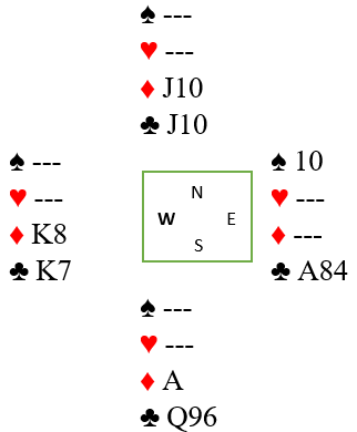 Etter å ha gitt bort hjerterstikket må spillefører ta alle trumfene først og komme til denne sluttposisjonen (hvis han har kvittet seg med hjerter 7!):