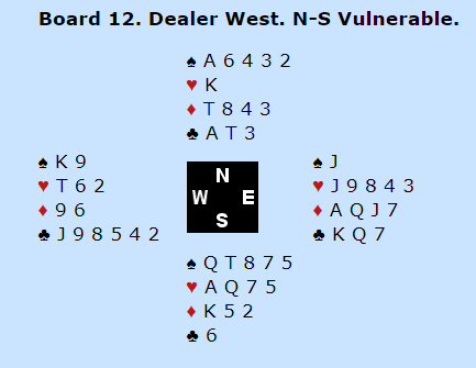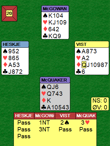 Gunn Tove Vist kunne benytte seg av en spesialkonvensjon mot nord sin 1 grand, 2 i major som viser firekorts farge og lang minor. Det bør være en hånd hvor man ville meldt inn 3 i i minor uansett, og dermed er det gunstig å få vist frem majorfargen på veien! Skottene kan kanskje ikke helt ha avalene i orden her? Syd bør ha en mulighet for å vise firekorts hjerter, for eksempel enkelt og greit en negativ dobling? Det fant imidlertid ut de hadde sparstopper, allright...så de prøvde 3 grand uten å bekymre seg særlig over GTV sin minorfarge. Og Gunn Tove spilte ut ruter dame som førte til at spillet var over på sekunder, seks ruterstikk og to ess til forsvaret, Norge +400.