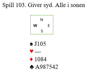 To par havnet i hjerterslem hvor det var to tapere. Det ene N/S-paret som var så heldig å sitte mot 6 hjerter doblet slemmen! Det var farlig business, for det ga Ø/V sjanse, og de burde antagelig "rømt" til 6 grand?