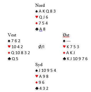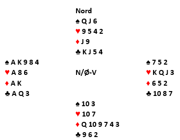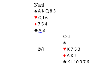 Med den veldig sterke hånden hos vest og brukbare verdier hos øst var det for mange vanskelig å stoppe under slem. Lilleslem i spar eller grand er egentlig samme spillet, normalt avhengig av 3-2 sits i spar og vellykket kløverfinesse. Som du ser går kløverfinessen galt, og ved nesten alle bordene der det ble meldt slem gikk spilleførerne bet. Men der syd forsøkte å være aggressiv i tredje hånd utenfor sonen og åpnet med 3 ruter fikk vest den hjelpen han trengte. Ruter knekt kommer ut mot 6 spar (eller grand). Vest vinner og tar for E-K i spar. Om han nå spiller nok en spar er kløverfinessen eneste mulighet, og det blir bet. Men etter syds 3 ruteråpning bør det vel ikke være alt for vanskelig å se at nord kan strippes for frikort før han spilles inn i spar? Etter to store spar spilles fire runder hjerter. Siden nord viser seg å ha fire hjerter er sluttspillet nokså tegnet. Vest tar for den andre ruterhonnøren og stripper dermed nord helt for røde kort. Dette blir igjen: