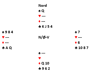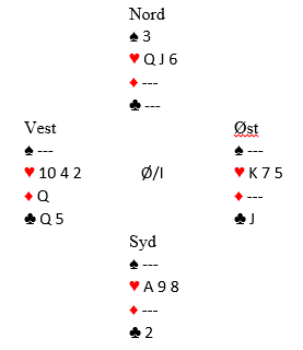 Hvem som har det kortet (kløver 2) skulle vise seg å være helt avgjørende. Normalt viser damen i utspill dobbelton når utspiller ikke har knekten. Men i dette tilfellet kan godt makker ha damen tredje fra start og spilt den ut, fordi han støttet til 3 kløver, og fordi å spille ut honnør fra honnør tredje i en slik situasjon ikke er uvanlig (nord har alle storkortene) for å gjøre det enkelt for makker (hvis nord for eksempel har kongen tredje og øst A-J sjette, og syd kan ha singel dame eller singel liten). Så at vest opprinnelig hadde tre kløver er langt i fra umulig. Jeg valgte å ta for den andre ruterhonnøren og fri meg i ruter for så å vente på vårt eventuelle hjerterstikk. Slik så hele spillet ut: