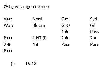 Bloom var kanskje litt for imponert over trumfstøtten sin da han meldte 4 spar, men han vet jo også at om det er den minste flik av sjanse for ti stikk så vil Gill helt sikkert være på hugget etter den.