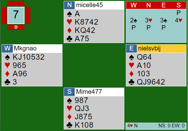 Helgemo er definitivt i den gruppen som mener det er best å melde inn med femkortsfarge i major fremfor å doble, og her gjorde han det også på tre-trinnet. Hans innmelding 3 hjerter gjorde det mye lettere for N/S da hele spillet så slik ut: