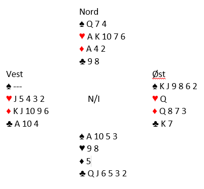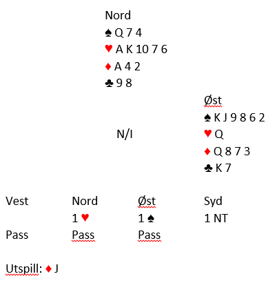 Om syd legger liten på spar konge for å beholde esset tar forsvaret beten, de har i så fall ett i spar, fire i ruter og A-K i kløver. Hvis syd stikker med spar ess blir syds hånd til en øde ørken. Da er det ikke mer enn to stikk i spar, to i hjerter og ett i ruter, totalt fem. I praksis får spillefører det sjette stikket i hjerter, men kontrakten kan ikke lenger vinnes etter dette motspillet. Ved det andre bordet spilte Ø/V for Oslo 2 en litt for høy delkontrakt, 4 ruter. Den ser bra ut, ikke mange tapere, men da forsvaret fikk spilt trumf i tide ble det for få stjelinger. Det endte med tre bet, +150 til N/S. Dette ga 5 IMP til Buskerud 1.