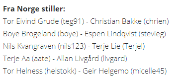 Norge stiller med fem par, og det skal spilles 6 x 16 spill, 2 sett hver av dagene mandag, onsdag og fredag. All informasjon om denne kampen finner du på et innlegg på NBF sin hjemmeside, her.