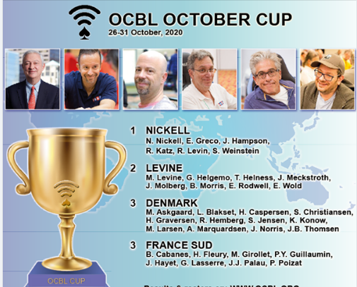 Tor Helness og Geir Helgemo pg lag LEVINE kunne ikke hindre at lag USA sitt "flaggskip" i bridge, lag NICKELL gikk til topps i OCBL OCTOBER CUP. Jørgen Molberg spilte også noen runder for lag LEVINE.