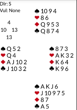 Da Nicolai Heiberg Evenstad og Nils Kåre Kvangraven vant en stor parturnering i USA forleden oppstod en nydelig sluttposisjon i en delkontrakt. Spillet forekom mot de som ble nr. 2 i turneringen, amerikanerne Daniel og Sam Lev.
