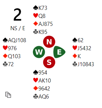 Merk at i 7 hjerter er det kun ett ruteravkast for spar hos øst, så en storeslem 7 hjerter er avhengig av sparfinessen.