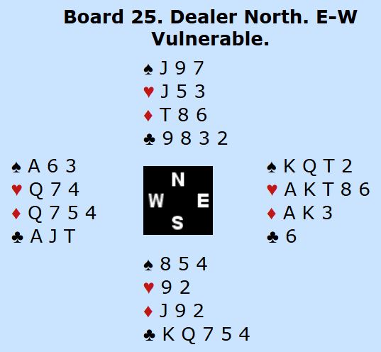 Det er tretten enkle stikk hvis sparfargen gir fire stikk – en god sjanse i seg selv når man også rår over tieren. Om ikke sparfargen gir fire stikk kan ruteren sitte 3-3 slik at vests fjerde ruter gir det trettende stikket. De sjansene er bra, men det er flere sjanser enn det - skvissjanser. Spesielt interesserte kan selv sette opp forskjellige sitser i spar og ruter hvor fargene ikke går av seg selv, og så analysere hvordan en eventuell skvis vil fungere. AT syd har den andre kløverhonnøren gjør at det kan være mange muligheter for skvis her.