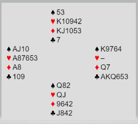 Kløver til esset og trumf til tieren. Idet den vinner stikket spilles rød farge til stjeling hos øst og nok en spar til finesse, nå med knekten. Hvis trumfen sitter 4-1 må det spilles slik, og så må spar ess tas. I så fall må kløveren sitte 3-2. Men her sitter trumfen 3-2, og da kan spillefører ta med seg 4-1 i kløver ved la spar ess ligge og ta en andre kløverrunde mens syd fortsatt har igjen trumfamen. Sitter kløveren 3-2, dvs. begge følger i andre kløverrunde er det bare å ta ut trumfen så å ta med seg den andre kløverrunden mens en trumf er igjen er gratis. Her oppdages at kløverfargen sitter 4-1 og siden andre kløver ikke ble stjålet at den med tre trumf har kløverlengden. En kløver trumfes med esset og så over til øst ved å stjele rød farge, ut med trumfen med kongen - tretten stikk. Merk at om andre kløver hadde blitt stjålet (fire kløvere hos nord) av syd ville det blitt bet ved å ta den tredje trumfrunden også, i så fall en kløvertaper.