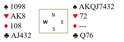 Geir Helgemo satt vest og åpnet med 1 kløver, pass fra nord og 1 spar fra Tor Eivind Grude. Syd meldte inn 2 ruter, og vest doblet, støttedobling som viser trekorts spar. Nord spratt til 4 ruter. Hva nå?