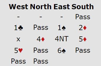 Grude gikk altså på med 4NT over nords 4 ruter. Syd forsøkte å forstyrre enda mer med 5 ruter, men nå kom nok engang DOPI i bruk for det norske paret. 5 hjerter viste to nøkkelkort (D=0, P=1). Da tok Grude sjansen på 6 spar. Han kan ikke være sikker på at vest har de riktige kortene til å fylle opp både i hjerter og kløver, men N/S sine aktive rutermeldinger tyder på at vest kanskje ikke har så mye bortkastet i den fargen.