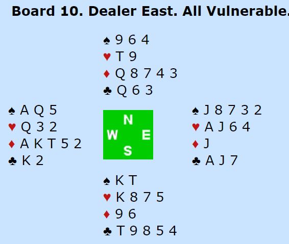 Ved det andre bordet åpnet vest med 1NT. Nord passet, og øst overførte til spar med 2 hjerter. Boye Brogeland meldte inn 3 ruter med en hånd han først hadde sagt pass. Vest pushet på med 3 spar, ikke noen opplagt melding! Så øst kunne vel vært mer optimistisk enn han var. Men det var også gunstig for Norge at Chrstian Bakke som satt nord med 6 – J943 – A9753 – K95 ikke støttet ruteren, men passet! For om det kom 4 eller 5 ruter fra nord kunne nok øst også ved det bordet vurdert det slik at vest kanskje har de riktige kortene. Men uten hjelp fra N/S og en litt pessimistisk skotte på østs plass stoppet de i 4 spar, 13 IMP til Norge.