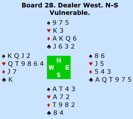 Willenken-Schaltz bruker altså Flannery, og da øst sa 3 kløver over åpningen 2 ruter ble 3 kløver kontrakten. Den spilte ikke så bra. Motspillet satt, og forsvaret fikk to sparstikk, to hjererstikk, tre ruterstikk og ett stikk for trumfknekten fjerde. Det er syv motspillstikk, med andre ord tre bet, N/S +150. Dermed ga spillet 6 IMP til italienerne, akkurat nok til å gå forbi å vinne kampen med 5 IMP.
