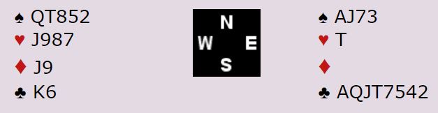 Øst, Agnethe Hansen Kjensli åpnet med 1 kløver. Fra syd kom 5 ruter! Det gikk pass, pass tilbake til Agnethe. Alt kan være riktig nå, men hun følte naturlig nok at hun måtte melde en gang til. Kanskje 5 spar er en mulighet? Hun sa imidlertid 6 kløver, og da hadde ingen noe å tilføye.