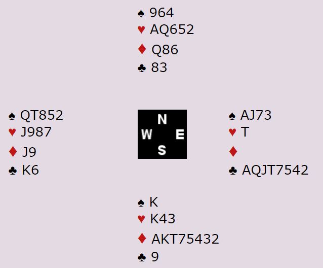Jeg har foreløpig ikke fått tak i noen som kunne fortelle om hun faktisk toppet sparen. I så fall ville det vel blitt tretten stikk siden hjertertaperen forsvinner på spar? Så kanskje hun tok sparfinesse som antagelig er beste sjanse. Skjedde et feilet antagelig syd ved ikke å skifte til hjerter idet hun vant for spar konge, men "fridde seg" med ruter? At det går slik er jo en mulighet for at 6 kløver skal kunne vinnes med akkurat tolv stikk. Da får N/S kun det sparstikket, men hjertertaperen forsvinner på sparfargen.
