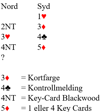 Hvis det er avtalen, vil nord i meldediagrammet si 4 spar som spørsmål om nøkkelkort i stedet for 4NT. Svaret blir i så fall 5 kløver - ett nøkkelkort. Da kan nord spørre etter trumfdamen med 5 ruter.