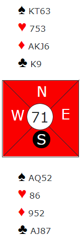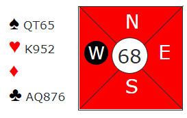 Hva slags system man ellers bruker spiller ingen rolle for dette, det nevnte problemet kan oppstå av og til uansett. Her tenker vi oss at N/S spiller med Stenberg 2NT (støtte, utgangskrav) som svar på 1 i majorfarge, og at åpnerens 3 ruter over 2NT simpelthen viser singelton. Uansett hvordan strukturen er over 2NT vil nord bli veldig optimistisk hvis han får vite om singel ruter hos syd!