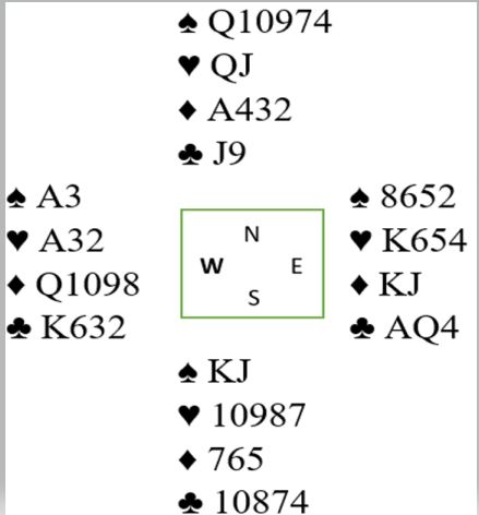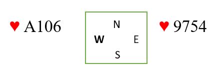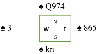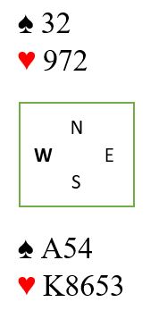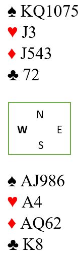Riktig spilleplan her er å stikke med hjerter ess i første stikk, så prøve sjansene i tur og orden. Muligheten for kun en kløvertaper fordi esset sitter foran bør om nødvendig prøves til slutt. Om øst har kløver ess sitter det der mot slutten også.
