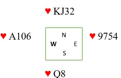 Før en lasjerer (automatisk) bør en tenke på hvem er det jeg ønsker å holde utenfor videre i spillet. Hvis det er motstanderen til høyre kan du lasjere. Hvis det ikke spiller noen rolle kan du stikke og spille en til hvis det for eksempel med fargen vi nettopp så på kun handler om å få trumfet en spar hos nord. Men la oss si majorfargene ser slik ut i en hjerterkontrakt: