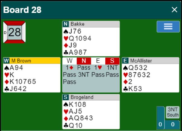 Vest spilte ut en liten ruter og allerede i første stikk ga en nier stikk da Brogeland forlangte ruter 9 fra bordet. Derfra hadde han bra kontroll, og det var ikke lett å spille motspill mot denne utgangen heller. Det endte med hele ti stikk, N/S + 630.